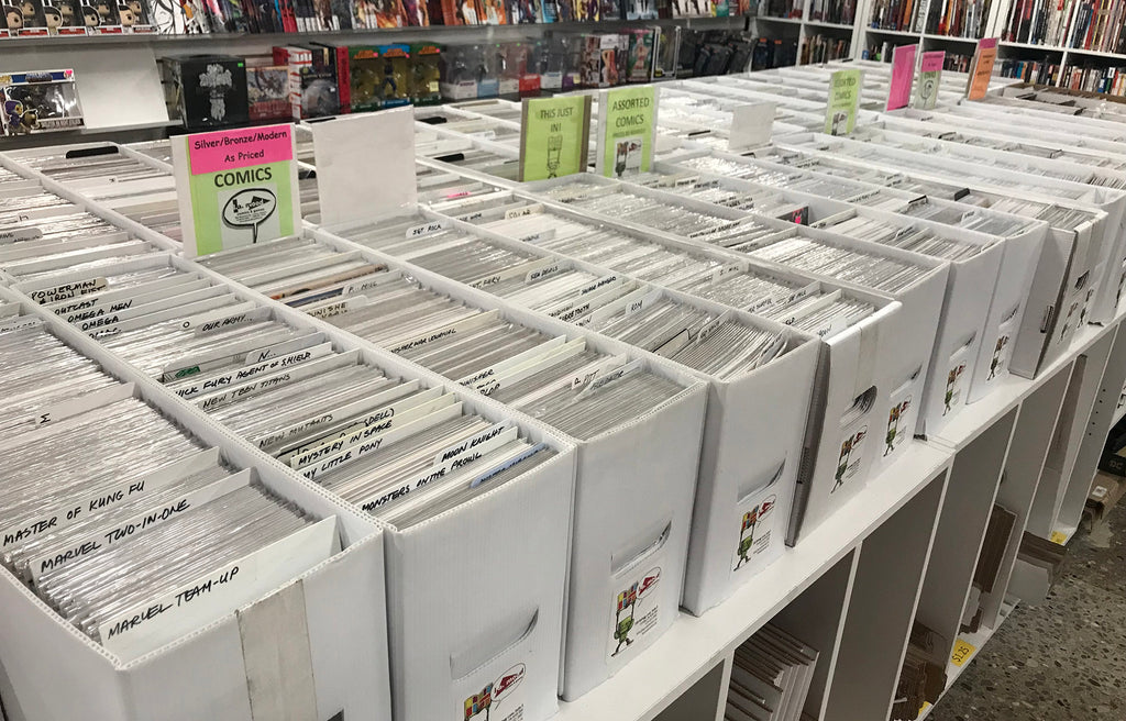 - 50% off all back issues in white boxes: Thousands of tales await in shaped universes, legendary characters. Now is the time to complete those missing series or discover a new favorite at half the cost! These are perfect for those who love diving deep into the comic world's history and discovering hidden gems. A huge selection of Indie, Marvel, and D.C. comics await.