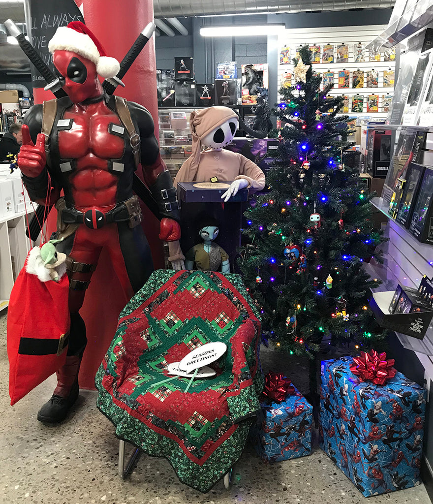 Our Deadpool statue has been transformed into Christmas Deadpool that we encourage everyone to take photos with.